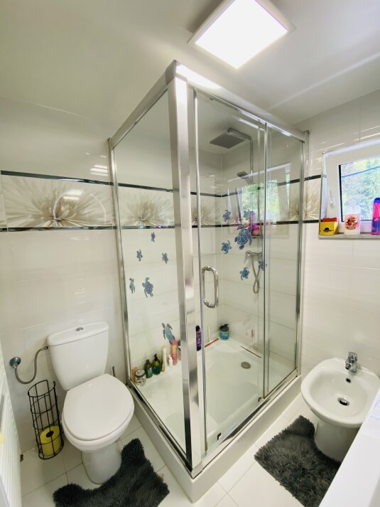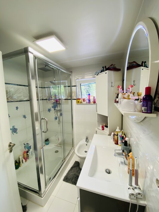 Modernes Badezimmer mit Dusche, Bidet, WC und Fenster