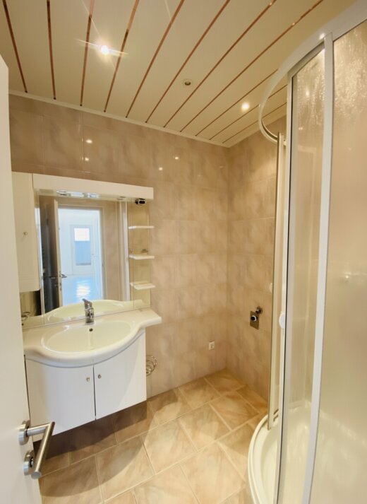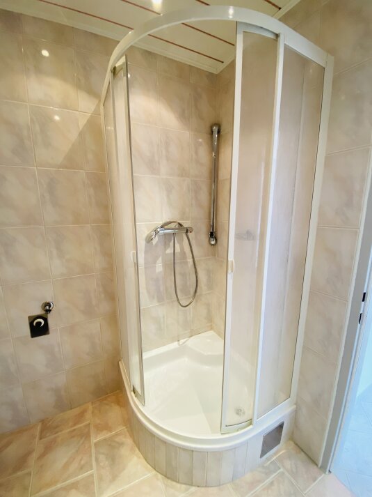 Badezimmer mit Dusche, Waschtisch, Sprossenheizkörper und Waschmaschinenanschluss