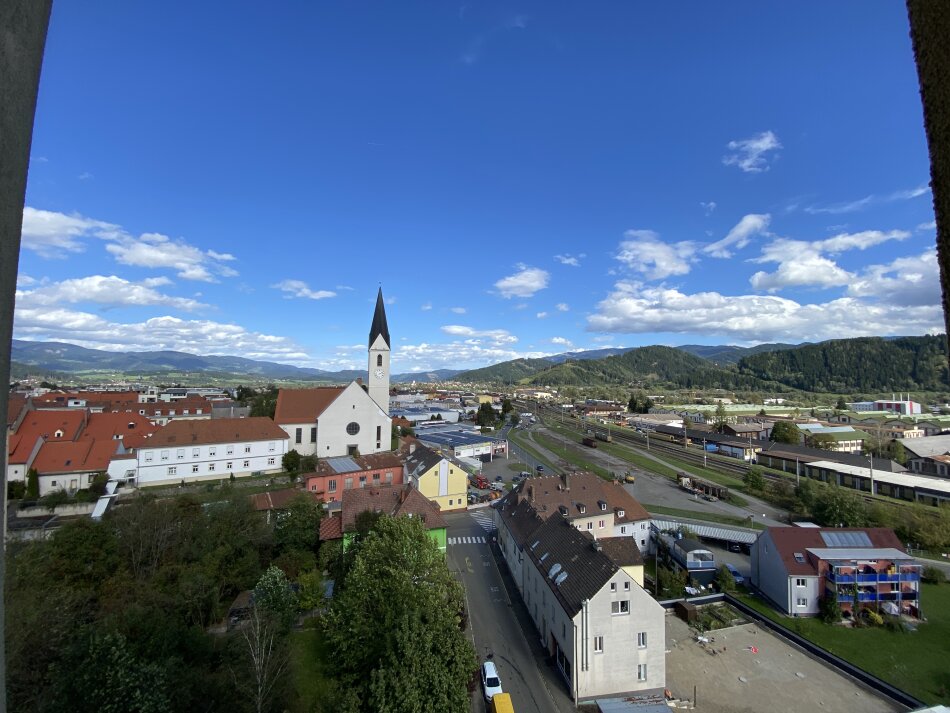 Küche (ohne Einbauküche – ideal zur individuellen Gestaltung) mit Blick auf die Stadtpfarrkirche Knittelfeld