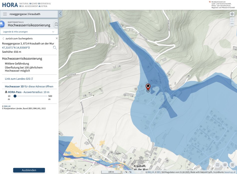Das Grundstück befindet sich in der Gelben bzw. teilweise in der Roten Gefahrenzone.