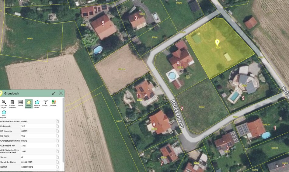 Dieses wunderschöne, sonnige Baugrundstück in Thal bei Graz, Brückenweg, bietet die perfekte Gelegenheit, Ihren individuellen Wohntraum in naturnaher Umgebung zu verwirklichen. Die ruhige Siedlungslage am Siedlungsrand, umgeben von Wäldern und Wiesen, garantiert ein hohes Maß an Lebensqualität und Privatsphäre.Mit einer großzügigen Grundstücksfläche von 1.457 m² und einer ebenen bis leicht geneigten Hanglage eignet sich das Grundstück ideal für den Bau eines Einfamilienhauses. Die Flächenwidmung als reines Wohngebiet mit einer Bebauungsdichte von 0,2–0,4 bietet flexible und attraktive Bebauungsmöglichkeiten.
