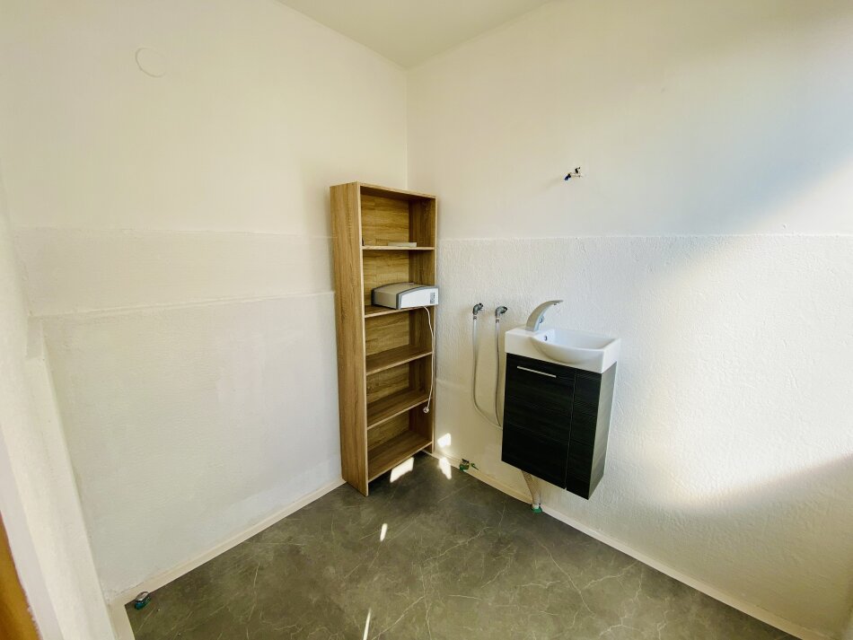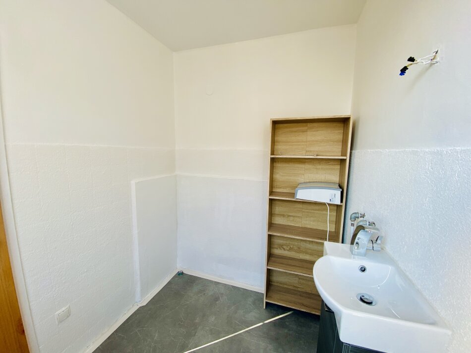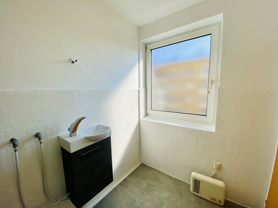 Das Badezimmer wurde bereits ausgeräumt, neu gestrichen und ist bereit für eine individuelle Neugestaltung. Dank des vorhandenen Fensters ist für natürliche Belichtung und Belüftung gesorgt.