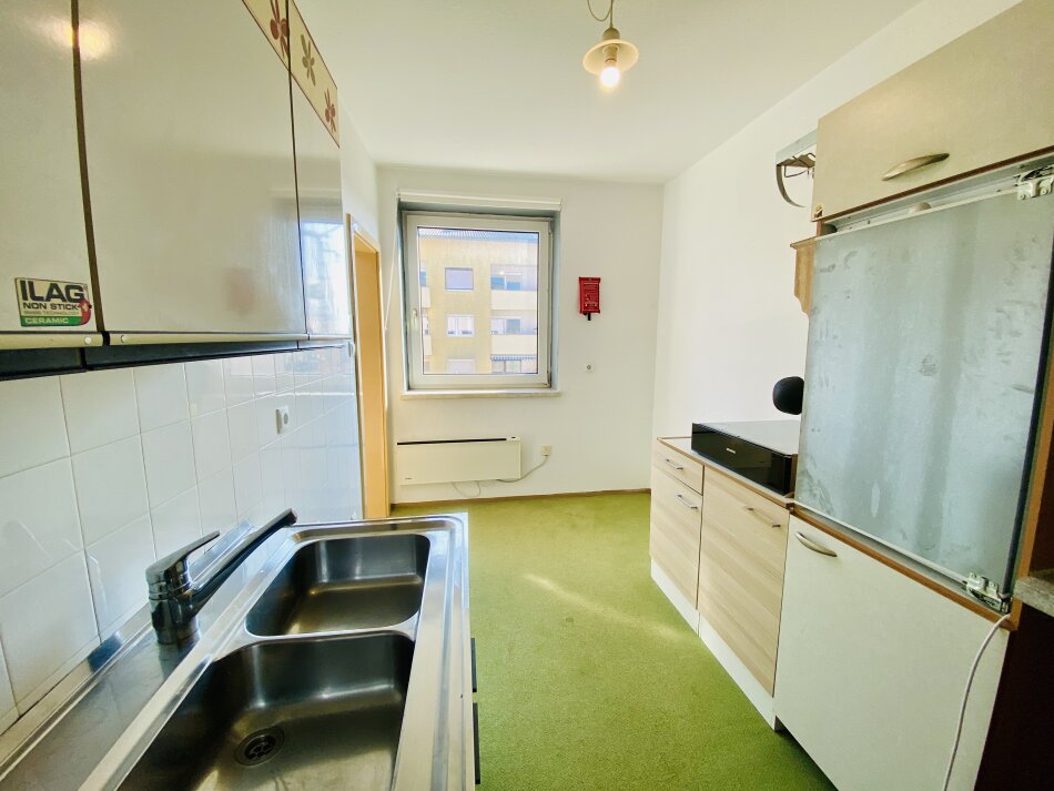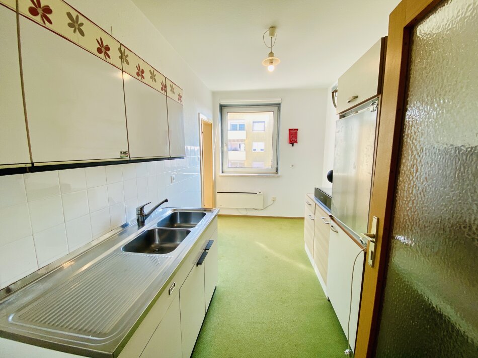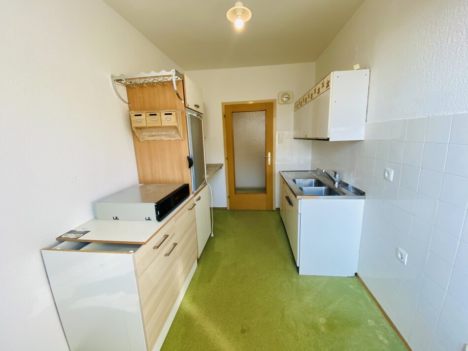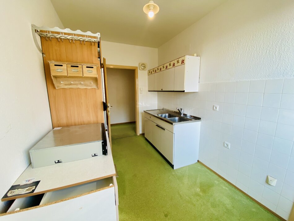 Die Küche verfügt über eine ältere Einbauküche ohne Herd und Backofen und bietet somit die Möglichkeit, diese ganz nach eigenen Vorstellungen neu zu gestalten.