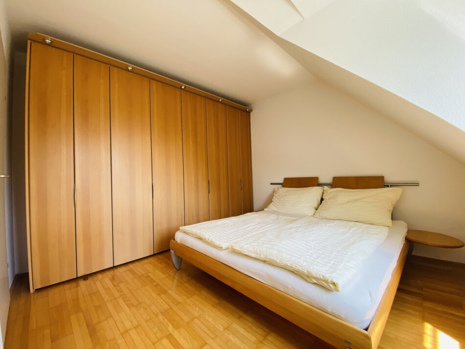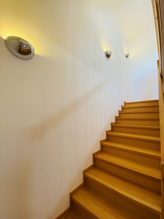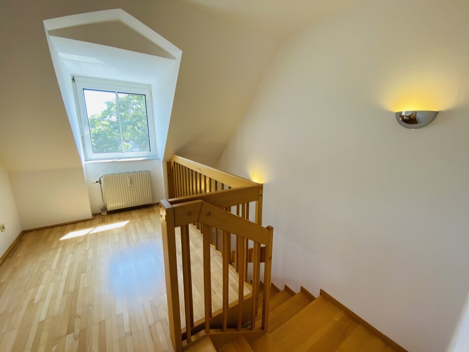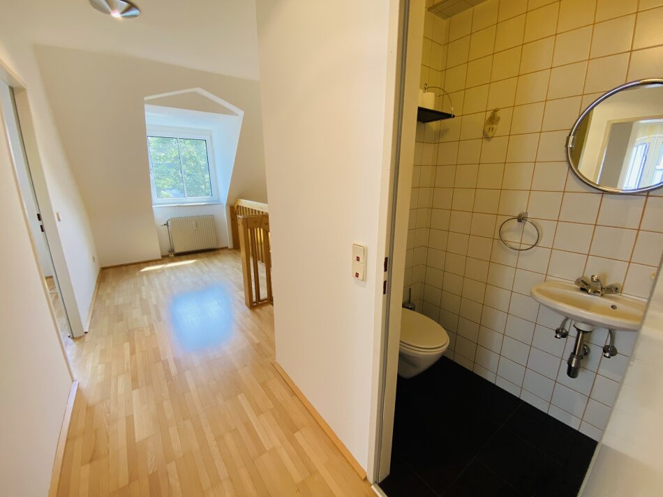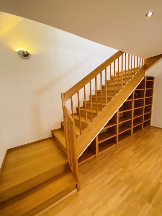 Über eine elegante Holztreppe erreichen Sie das ausgebaute Dachgeschoss, wo eine offene Galerie zur Verfügung steht – ideal als Homeoffice-Bereich, Leseecke oder ruhiger Rückzugsort.