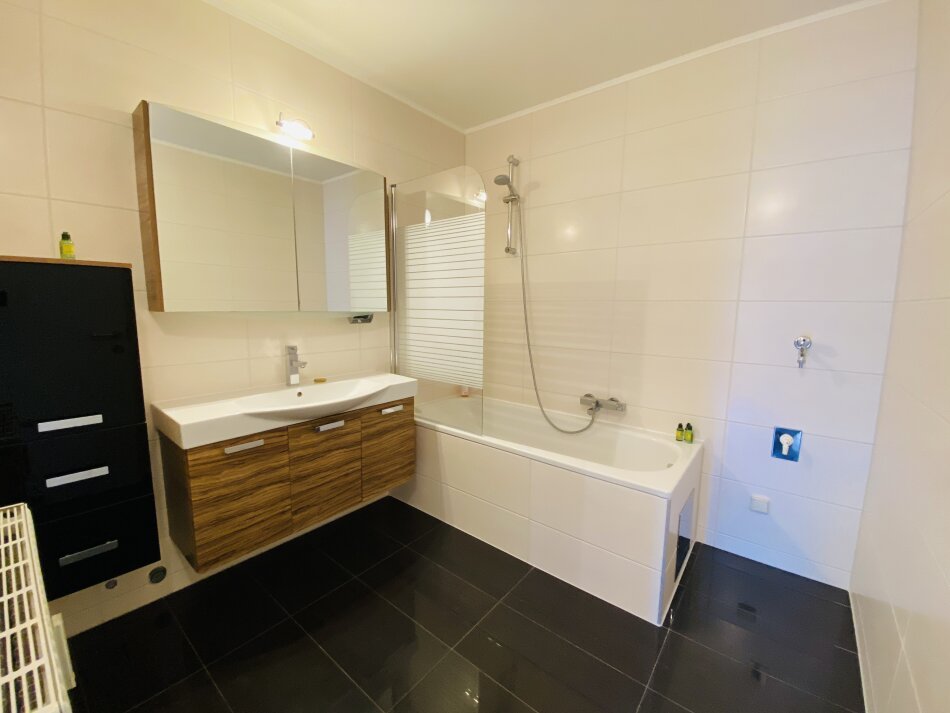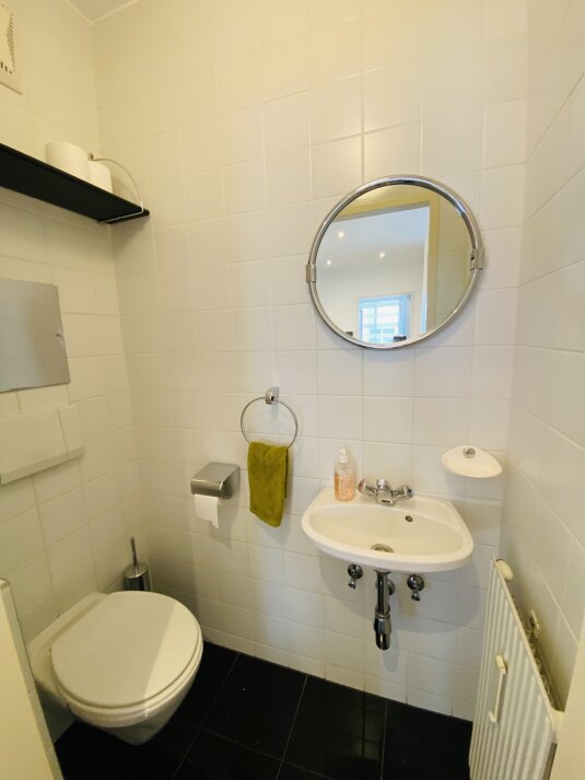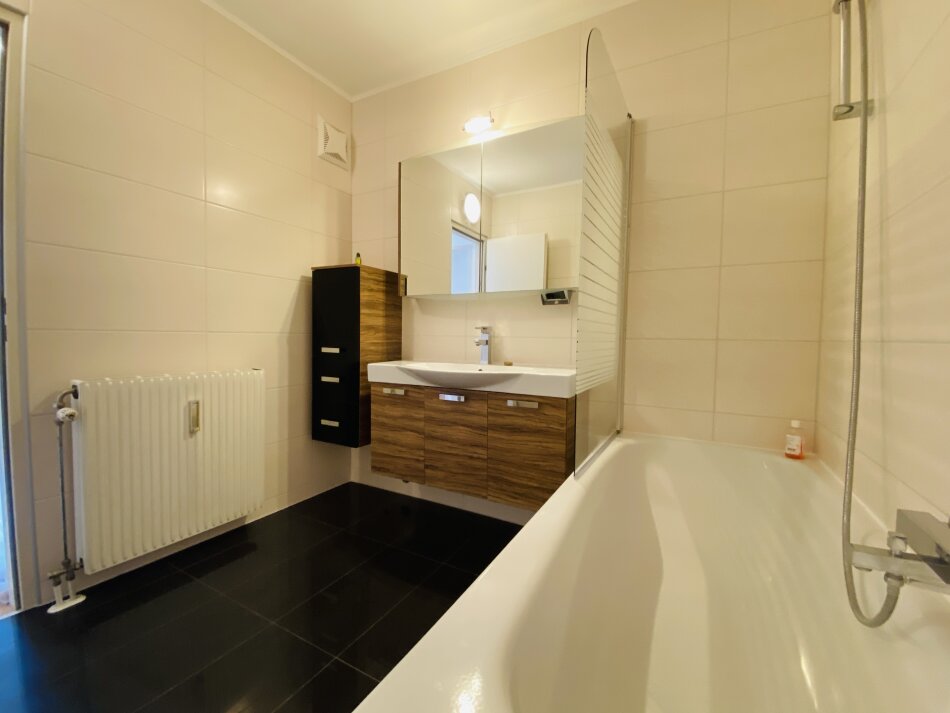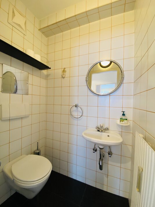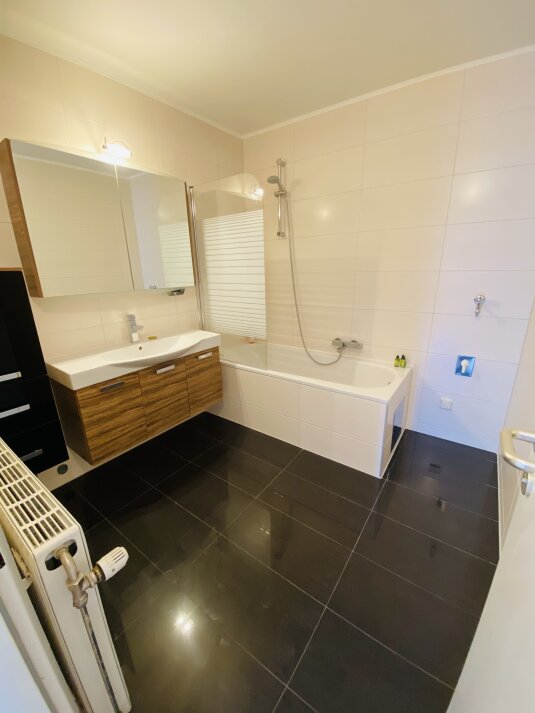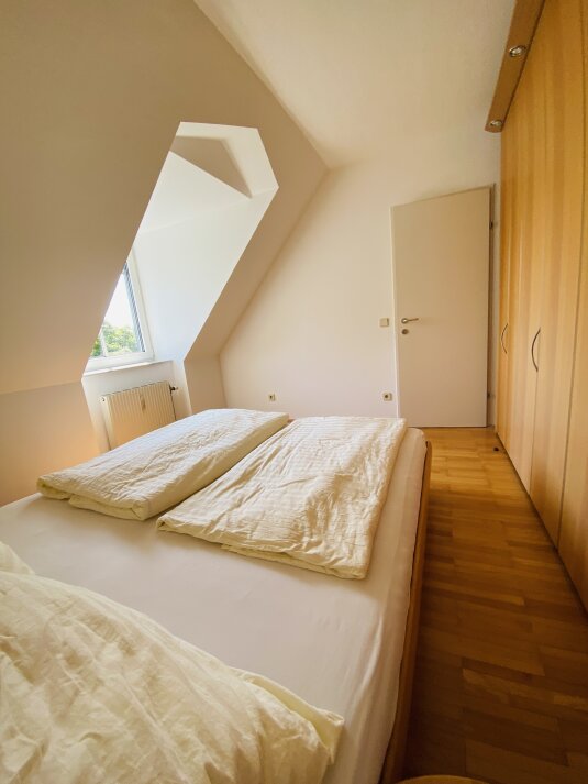 Im oberen Bereich befinden sich zwei freundliche, ruhig gelegene Schlafzimmer mit hochwertigem Parkettboden. Außerdem erwartet Sie ein stilvoll ausgestattetes Badezimmer mit Badewanne, Spiegelschrank und Waschtisch, sowie ein separates WC.